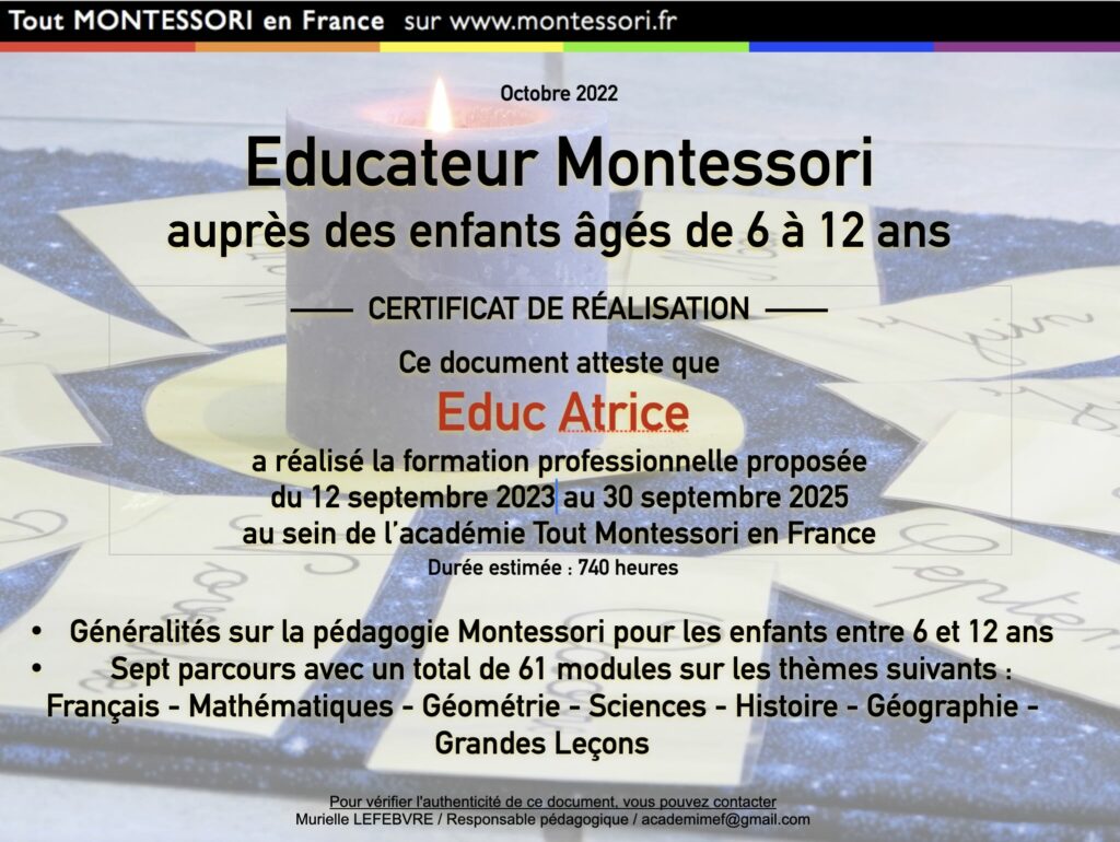Enfin, nous ne sommes pas que des théoriciens puisque notre équipe est aussi sur le terrain, c’est-à-dire que nous sommes des éducateurs Montessori au quotidien (et aussi des parents d’enfants en âge d’être instruits). Ce qui nous permet de comprendre les enfants, mais aussi les stagiaires, les parents, les professionnels. Vérifiez bien ceci auprès des personnes qui prétendent vous former : sont-elles en contact direct avec les enfants ? Car la théorie c’est bien, mais sans pratique, cela reste abstrait.
